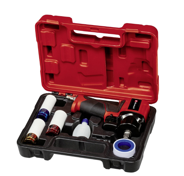 The compressed air impact driver TC-PW 610 Compact proves itself with 6.3 bar maximum working pressure especially in the transition period, in spring and autumn, as an indispensable aid in the garage and workshop. The powerful impact driver with a maximum torque of 610 Nm is a real support when changing car tires. Thanks to its high performance, the impact driver is also suitable for demanding tasks. The compact design of the impact driver is ideal for working in places that are difficult to access, and the low weight of the product also ensures a pleasant handling, even during lengthy work. One-handed operation is possible through the ergonomic left/right switching. The compressed air impact driver is equipped with left (single-stage) and right-handed rotation (three-stage). The non-slip, rubberized grip enables a safe working. The impact driver has a 1/2″-square drive, the best performance it delivers from a hose inner diameter of 9 mm. The delivery includes 3 sockets with plastic sleeve in the sizes 17/19/21 mm, 1 oil bottle, 1 plug nipple and 10 m thread sealing tape in a practical transport and storage case.